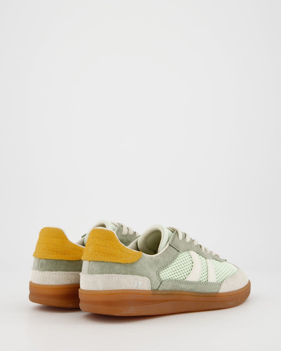 Zapatillas deportivas bajas de inspiración indoor soccer. Corte de piel tipo serraje combinado con nylon efecto malla. Cierre con cordonera y talón ligeramente acolchado, con múltiples pespuntes hecho de piel serraje contrastada. Suela fina de goma y gel. El gel es visible en la planta ya que este se encuentra de manera interna en la parte del talón para mejorar la amortiguación.