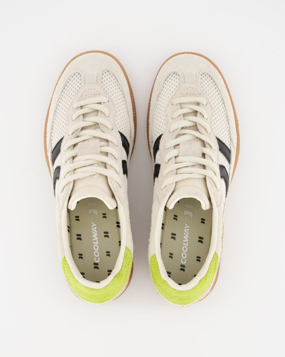 Zapatillas deportivas bajas de inspiración indoor soccer. Corte de piel tipo serraje combinado con nylon efecto malla. Cierre con cordonera y talón ligeramente acolchado, con múltiples pespuntes hecho de piel serraje contrastada. Suela fina de goma y gel. El gel es visible en la planta ya que este se encuentra de manera interna en la parte del talón para mejorar la amortiguación.