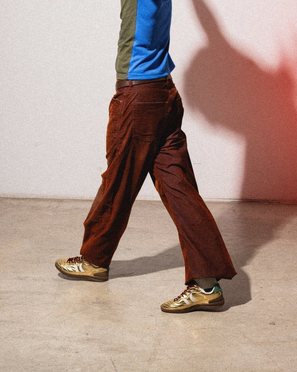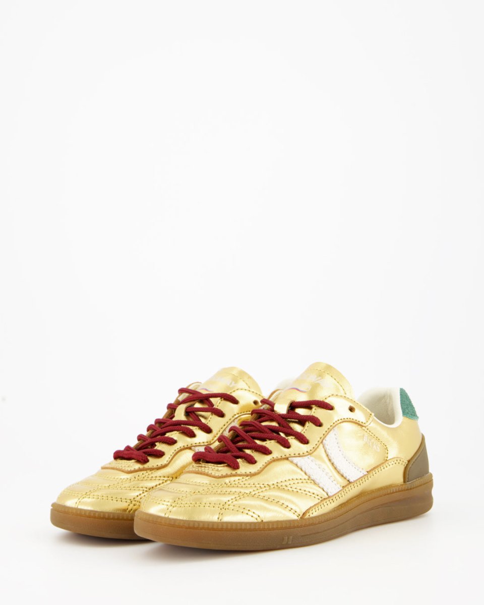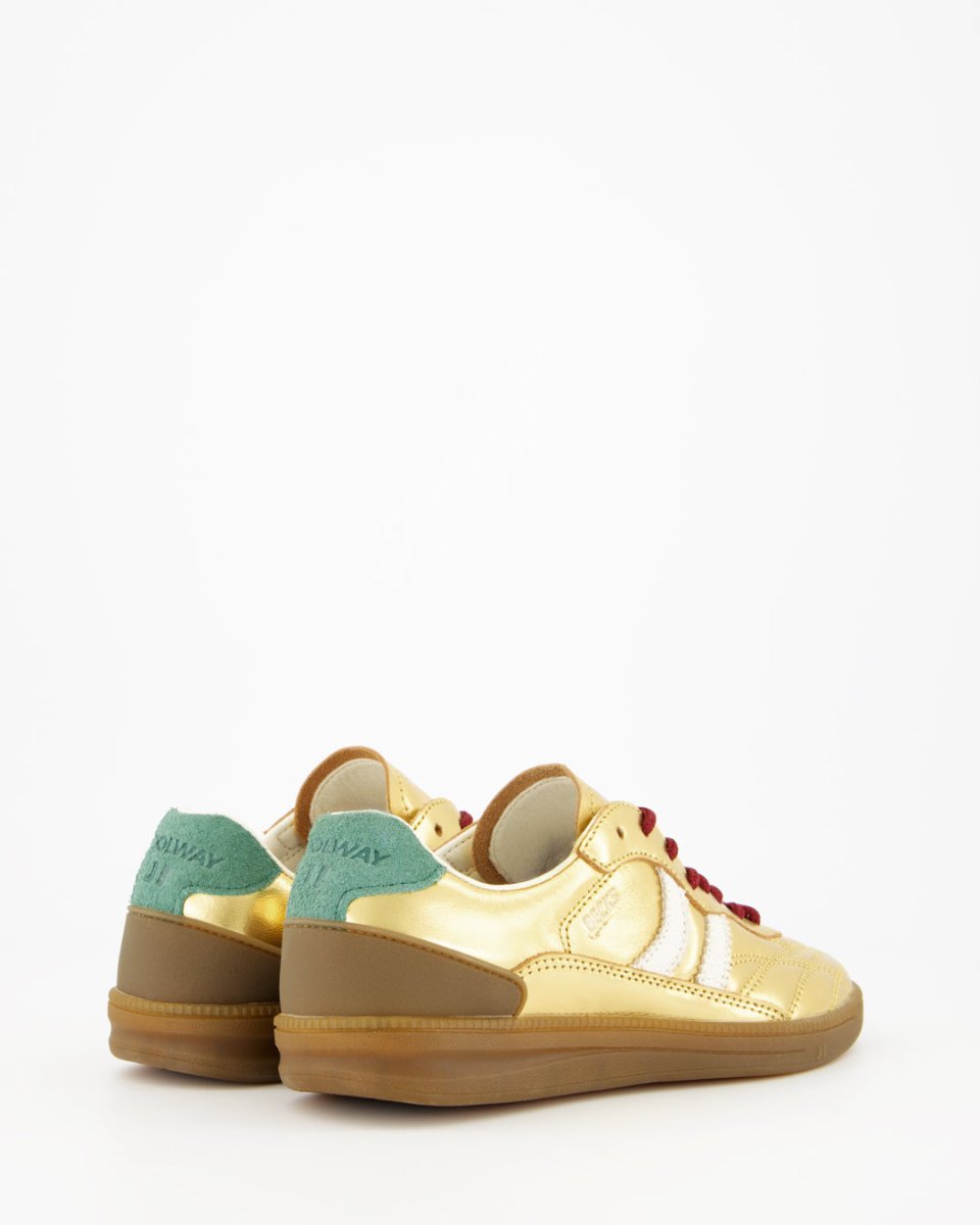 Zapatillas deportivas bajas de inspiración indoor soccer. Corte de piel pulida combinada con serraje al tono. Como peculiaridad tiene una lengüeta vuelta y pespunteada, con posibilidad de quitarla o ponerla. Cierre con cordonera y talón ligeramente acolchado, con múltiples pespuntes hecho de piel serraje contrastada. Suela fina de goma y gel. El gel es visible en la planta ya que este se encuentra de manera interna en la parte del talón para mejorar la amortiguación.