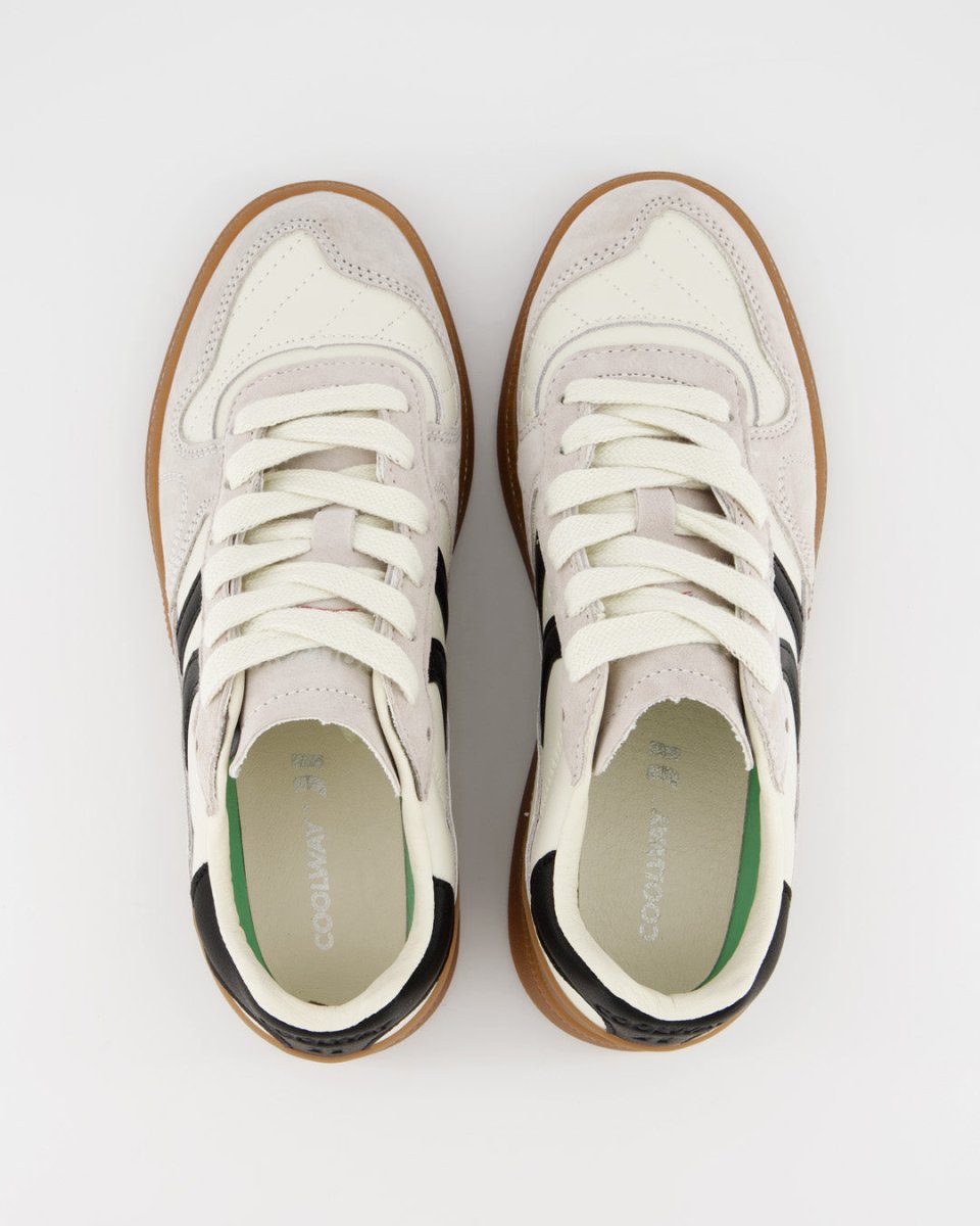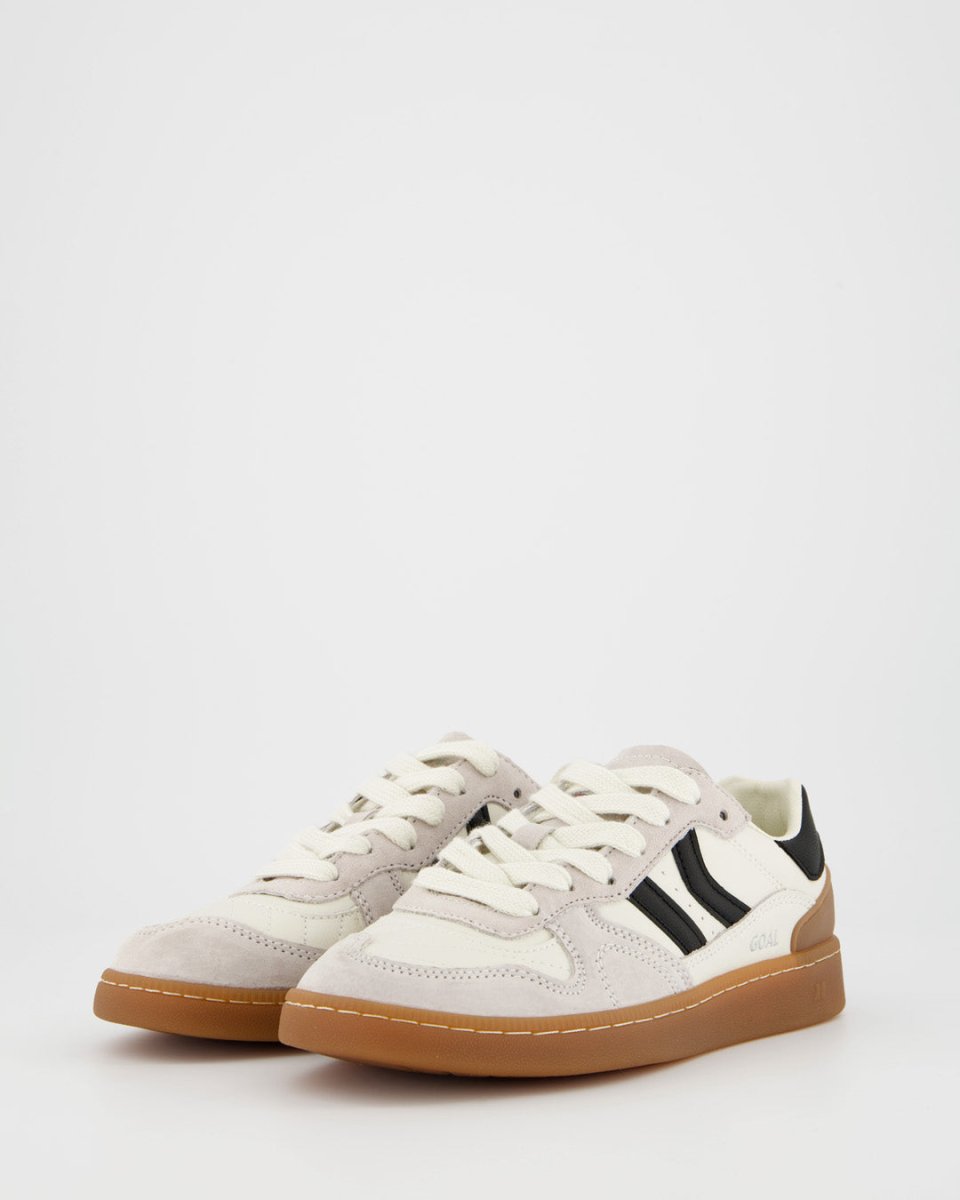 Zapatilla deportiva de serraje con detalles en contraste de color. Lengüeta de piel y preformada con un acolchado figurado. Vistas del forro en piel. Cordones planos de algodón en dos tonos intercambiables. Cuello ligeramente acolchado. La parte delantera lleva un refuerzo de pespuntes. Suela flexible de goma/caucho que aporta durabilidad y agarre. Cuenta con el nombre del modelo “GOAL” en lateral en oro viejo.