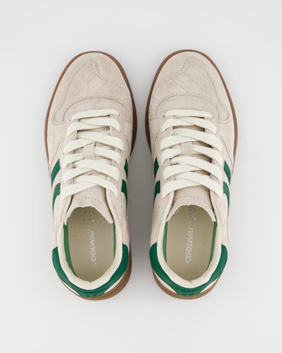Zapatilla deportiva de serraje con detalles en contraste de color. Lengüeta de piel y preformada con un acolchado figurado. Vistas del forro en piel. Cordones planos de algodón en dos tonos intercambiables. Cuello ligeramente acolchado. La parte delantera lleva un refuerzo de pespuntes. Suela flexible de goma/caucho que aporta durabilidad y agarre. Cuenta con el nombre del modelo “GOAL” en lateral en oro viejo.