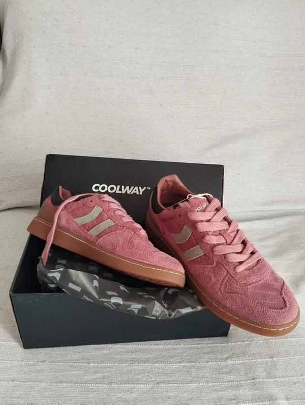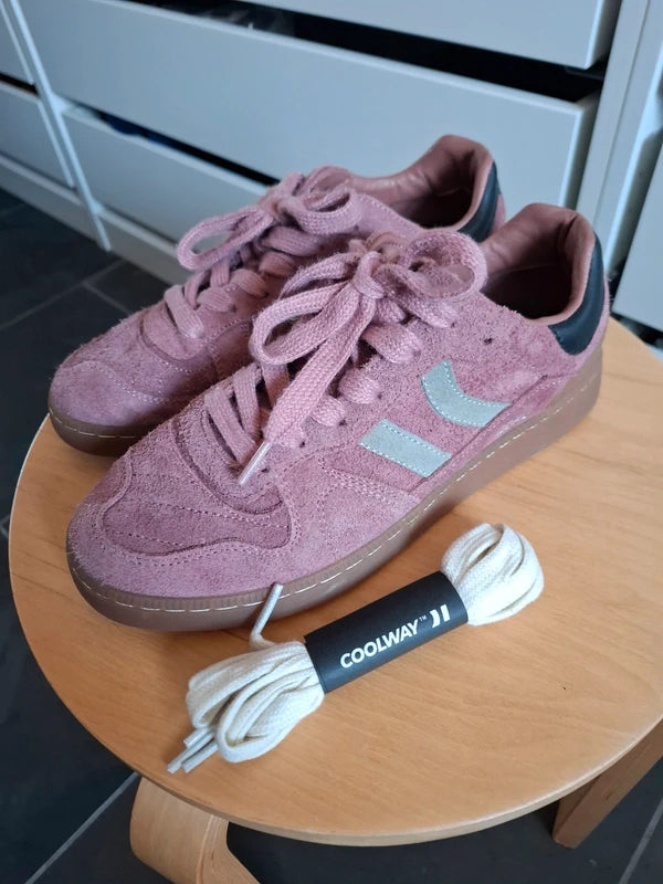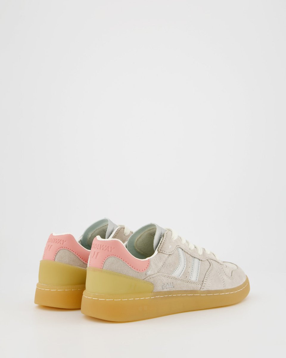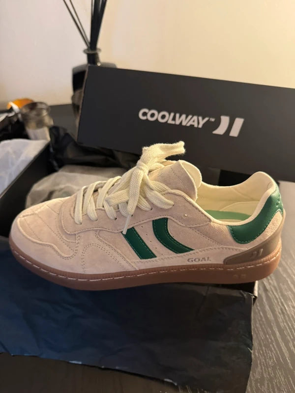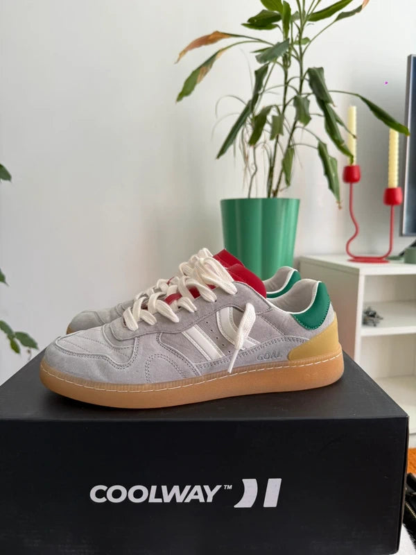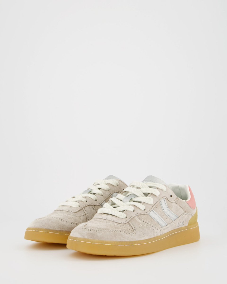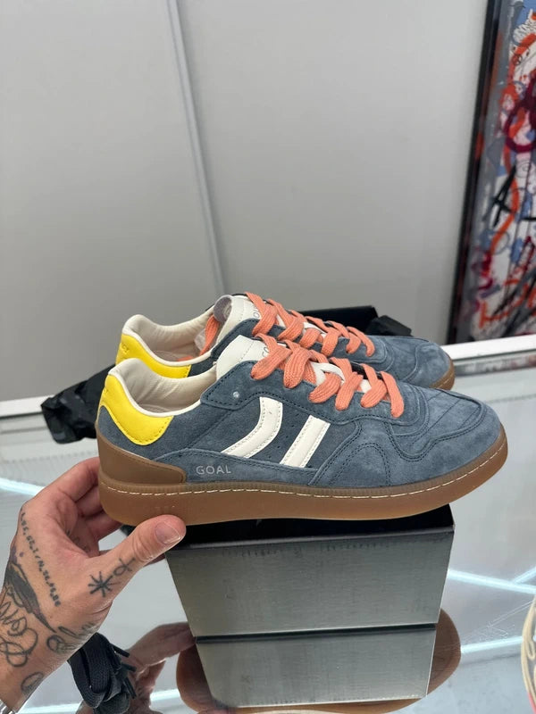 Zapatilla deportiva de serraje con detalles en contraste de color. Lengüeta de piel y preformada con un acolchado figurado. Vistas del forro en piel. Cordones planos de algodón en dos tonos intercambiables. Cuello ligeramente acolchado. La parte delantera lleva un refuerzo de pespuntes. Suela flexible de goma/caucho que aporta durabilidad y agarre. Cuenta con el nombre del modelo “GOAL” en lateral en oro viejo.