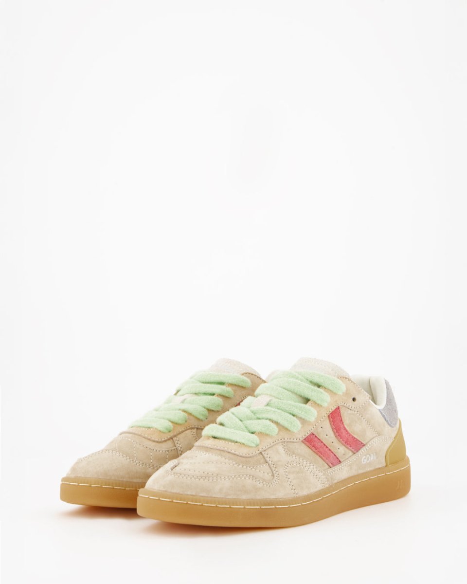 Zapatilla deportiva de serraje con detalles en contraste de color. Lengüeta de piel y preformada con un acolchado figurado. Vistas del forro en piel. Cordones planos de algodón en dos tonos intercambiables. Cuello ligeramente acolchado. La parte delantera lleva un refuerzo de pespuntes. Suela flexible de goma/caucho que aporta durabilidad y agarre. Cuenta con el nombre del modelo “GOAL” en lateral en oro viejo.