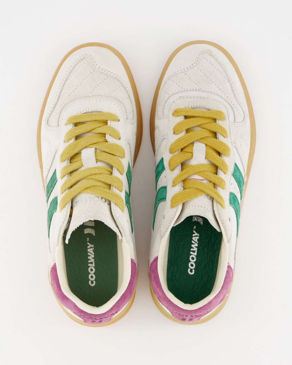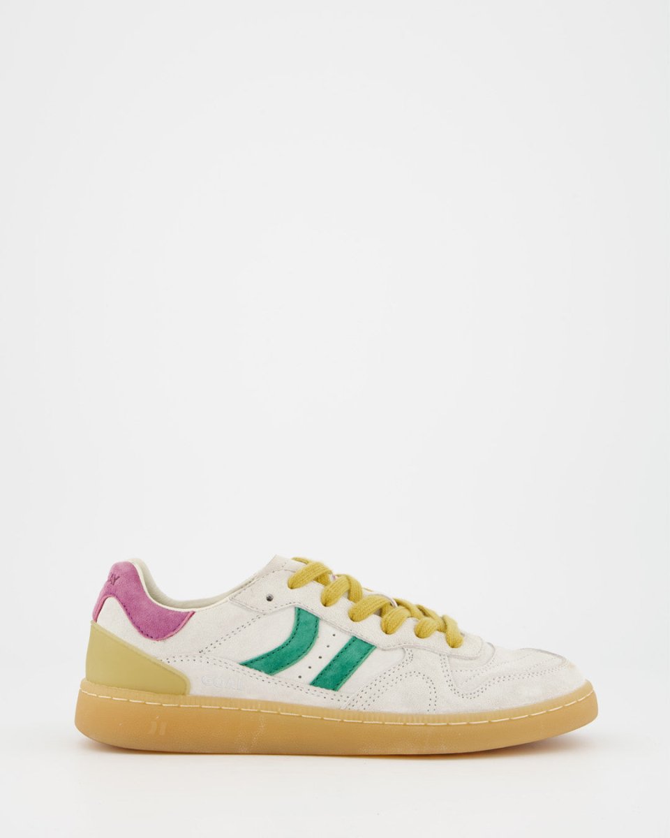 Zapatilla deportiva de serraje con detalles en contraste de color. Lengüeta de piel y preformada con un acolchado figurado. Vistas del forro en piel. Cordones planos de algodón en dos tonos intercambiables. Cuello ligeramente acolchado. La parte delantera lleva un refuerzo de pespuntes. Suela flexible de goma/caucho que aporta durabilidad y agarre. Cuenta con el nombre del modelo “GOAL” en lateral en oro viejo.