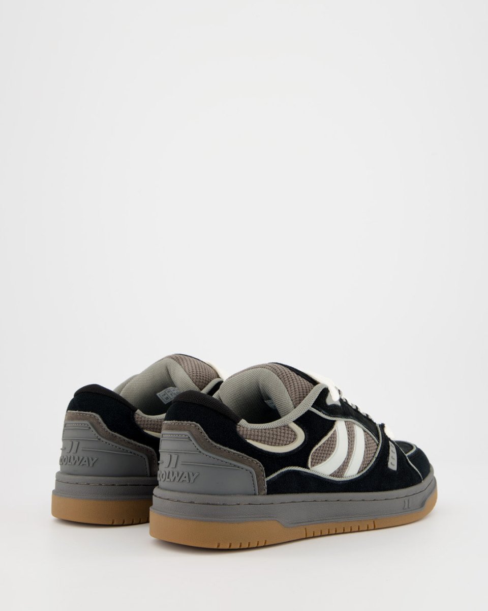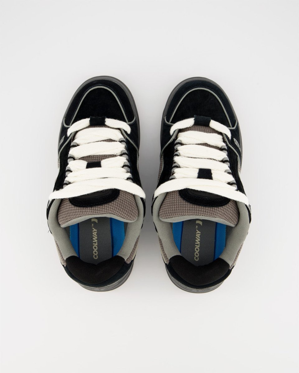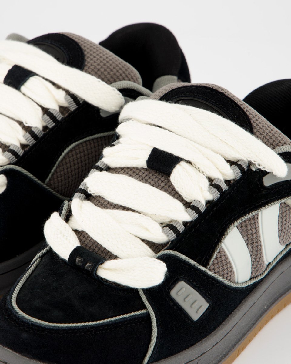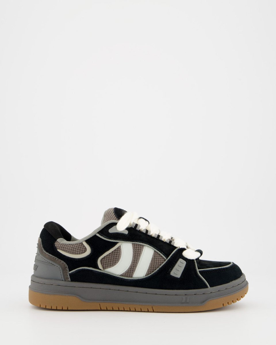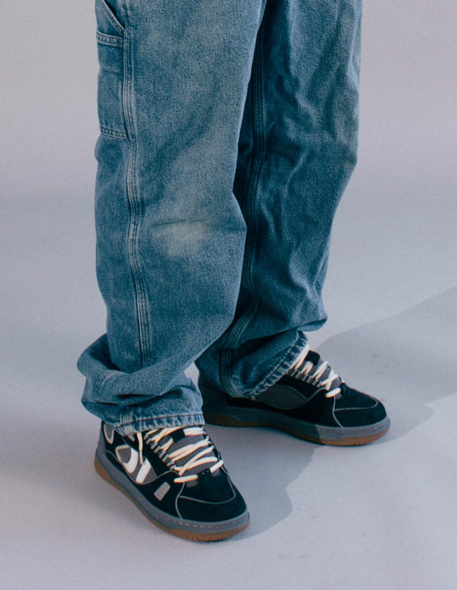 Zapatillas deportivas bajas inpiradas en el skate de los 90. Corte de piel / piel tipo serraje combinado con un tejido con textura. Lengüeta ultra-padded (súper acolchada), cierre de cordonera y talón acolchado. Multiples detalles de tpu y piezas en el patrón. Suela de goma en el exterior y con interior de phylon (EVA expandida) para mejor amortiguación y ligereza. El phylon es visible en la planta ya que la goma cuenta con unas aberturas que forman parte del diseño.