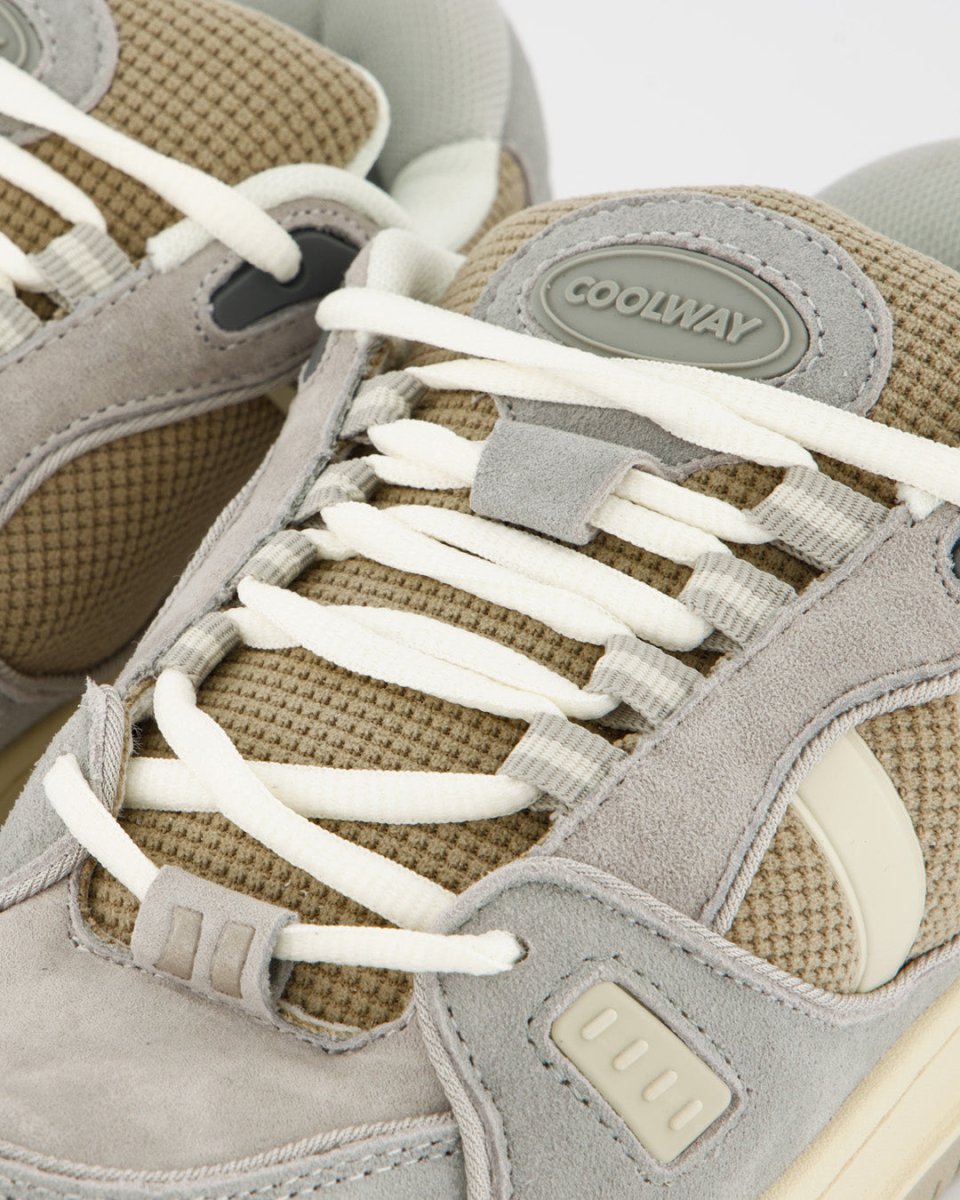 Zapatillas deportivas bajas inpiradas en el skate de los 90. Corte de piel / piel tipo serraje combinado con un tejido con textura. Lengüeta ultra-padded (súper acolchada), cierre de cordonera y talón acolchado. Multiples detalles de tpu y piezas en el patrón. Suela de goma en el exterior y con interior de phylon (EVA expandida) para mejor amortiguación y ligereza. El phylon es visible en la planta ya que la goma cuenta con unas aberturas que forman parte del diseño.