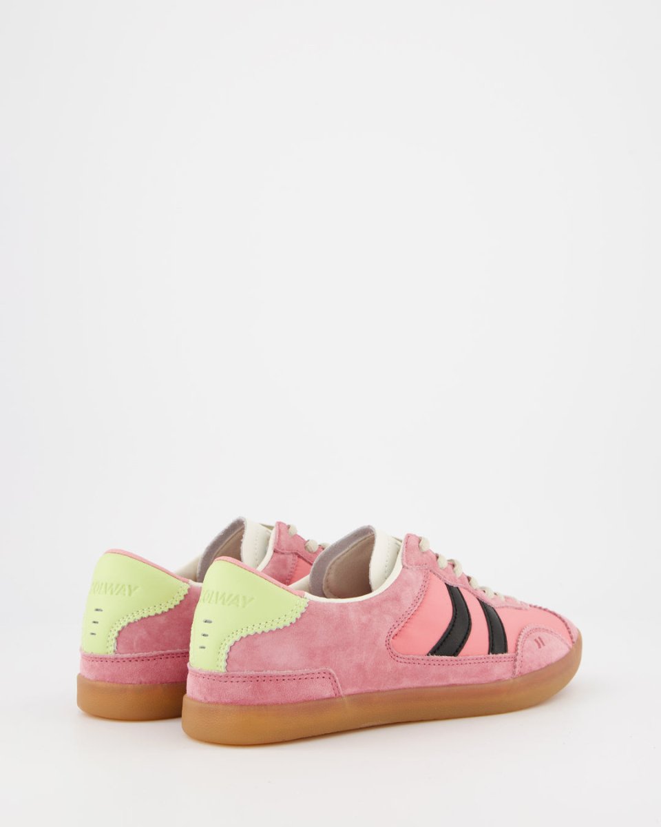 Zapatillas deportivas bajas de piel tipo serraje combinado con nylon. Corte sencillo y clásico con cierre de cordones. La pieza de talón y el logo contrastan tanto por color como por textura. La plantilla de foam acolchada lleva impreso un diseño multilogo. El forro de piel contrasta en la parte trasera siguiendo el tono del corte. La suela de goma ligera en colores miel lleva un pespunte en la base que refuerza la unión entre el corte y la misma suela.