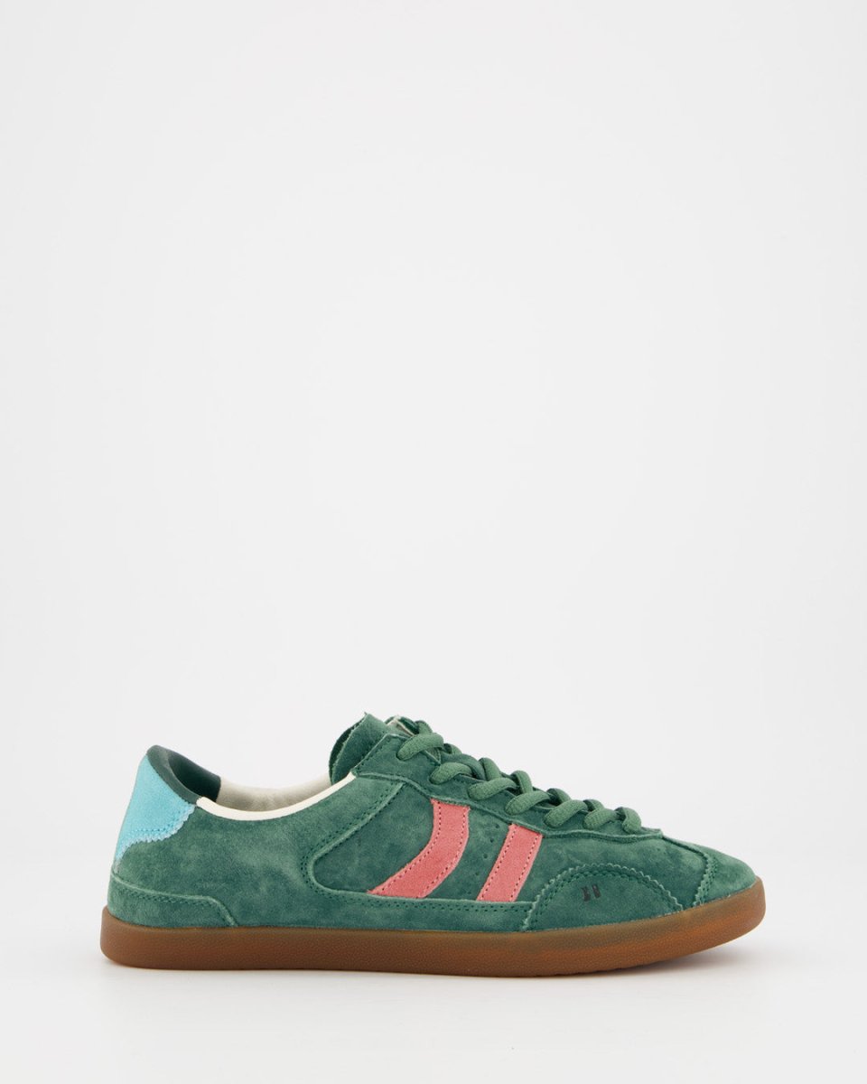 Zapatillas deportivas bajas de piel tipo serraje. Corte sencillo y clásico con cierre de cordones. La pieza de talón y el logo contrastan tanto por color como por textura. La plantilla de foam acolchada lleva impreso un diseño multilogo. El forro de piel contrasta en la parte trasera siguiendo el tono del corte. La suela de goma ligera en colores miel lleva un pespunte en la base que refuerza la unión entre el corte y la misma suela.