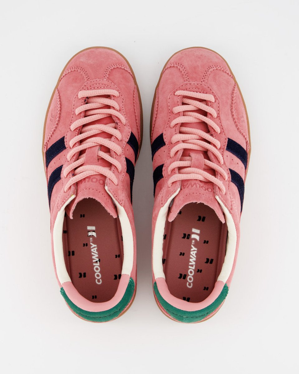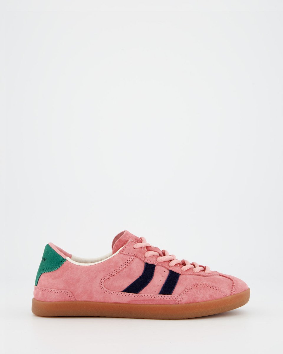 Zapatillas deportivas bajas de piel tipo serraje. Corte sencillo y clásico con cierre de cordones. La pieza de talón y el logo contrastan tanto por color como por textura. La plantilla de foam acolchada lleva impreso un diseño multilogo. El forro de piel contrasta en la parte trasera siguiendo el tono del corte. La suela de goma ligera en colores miel lleva un pespunte en la base que refuerza la unión entre el corte y la misma suela.
