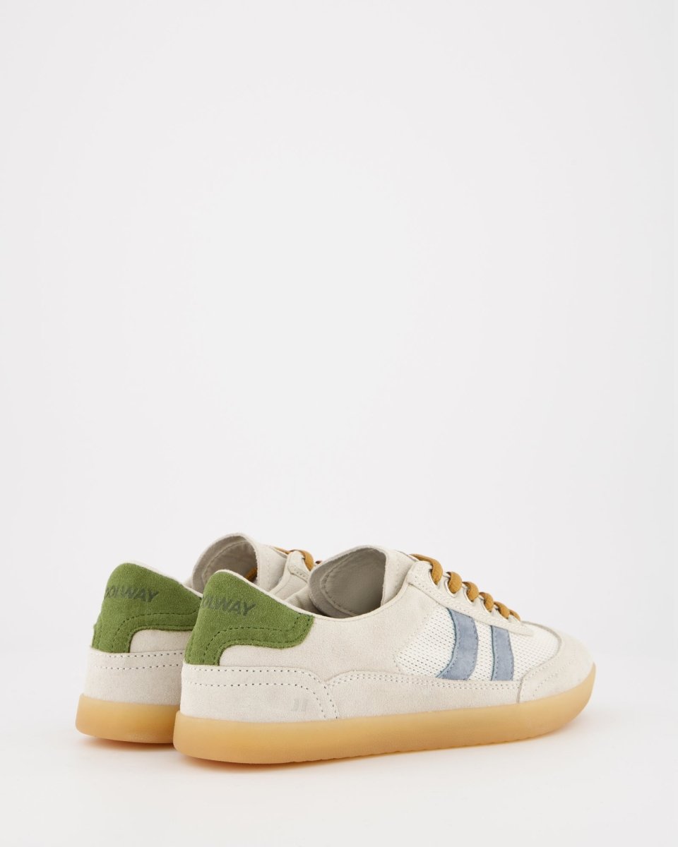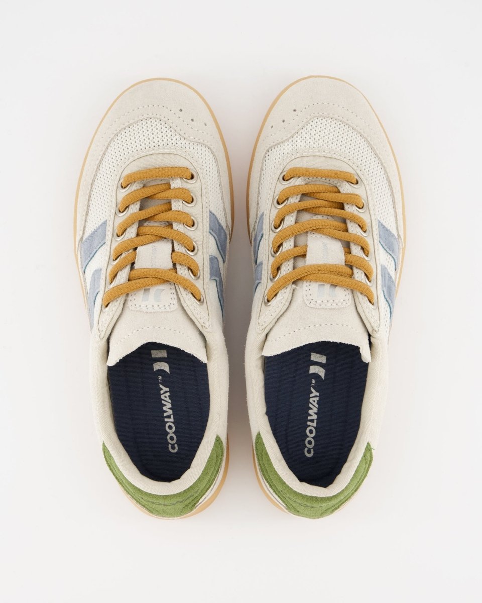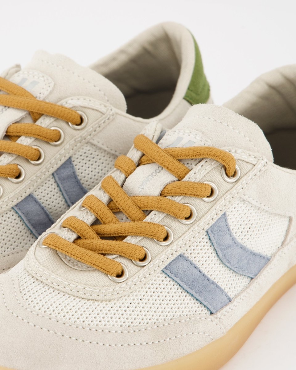 Zapatillas deportivas bajas de inspiración tenis. Corte de piel serraje combinada con un tejido transpirable “red” (mesh) al tono. Cuenta con unos ojetes/eyelets metálicos y un cierre tipo cordonera. El cuello está ligeramente acolchado y tanto nuestro logo “dual” como la pieza trasera van a contraste con la base de la zapatilla. Siguiendo la estética tenis, forro y plantillas son de tejido de algodón (canvas). La suela ligera de goma en colores miel lleva un pespunte en la base que refuerza la unión entre suela y corte.