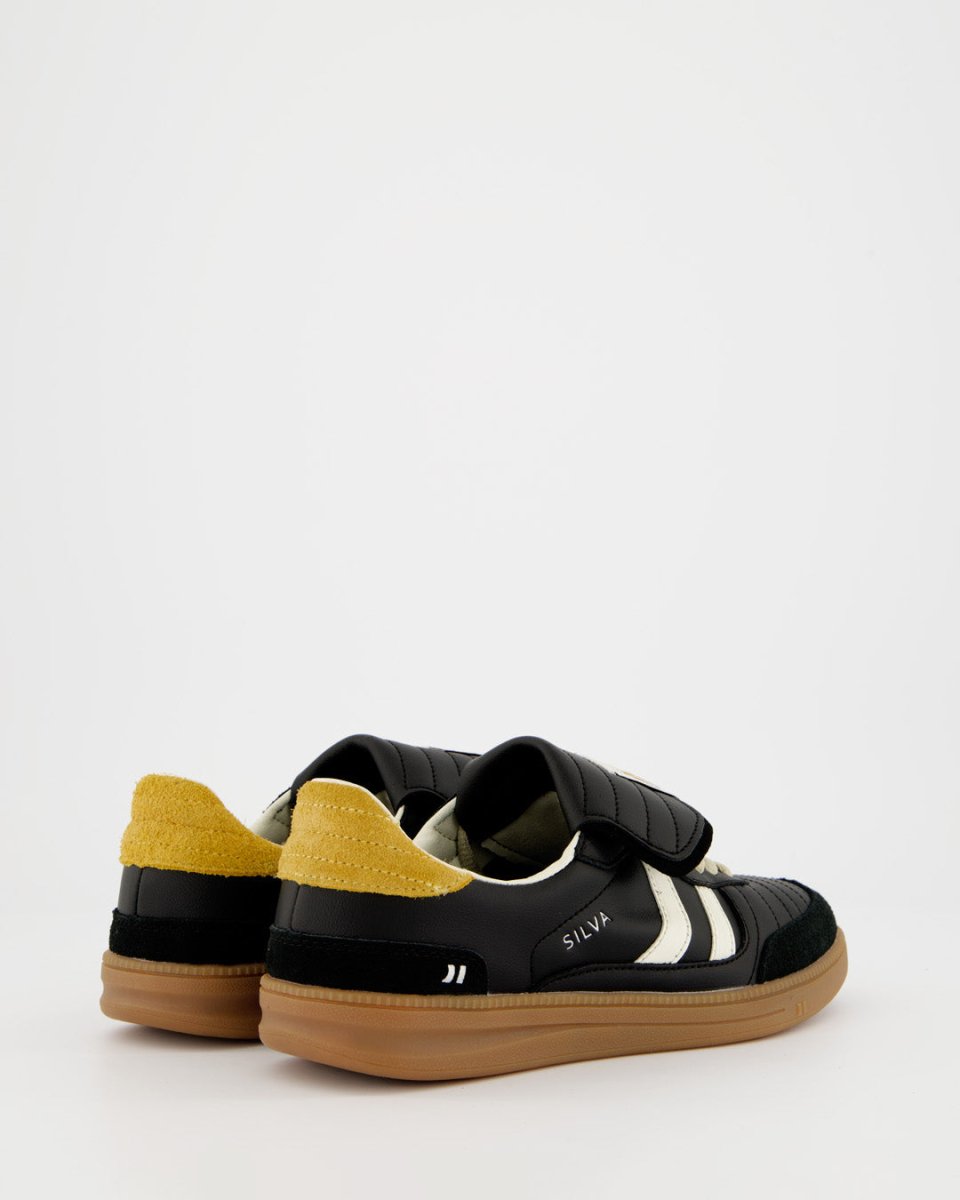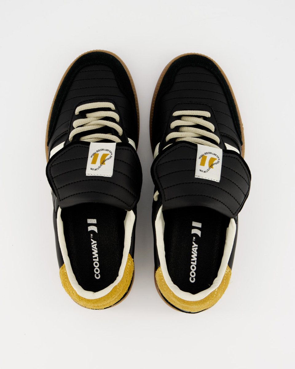 Zapatillas deportivas bajas de inspiración indoor soccer. Corte de piel pulida combinada con serraje al tono. Como peculiaridad tiene una lengüeta vuelta y pespunteada. Cierre con cordonera y talón ligeramente acolchado, con múltiples pespuntes hecho de piel serraje contrastada. Suela fina de goma y gel. El gel es visible en la planta ya que este se encuentra de manera interna en la parte del talón para mejorar la amortiguación.
