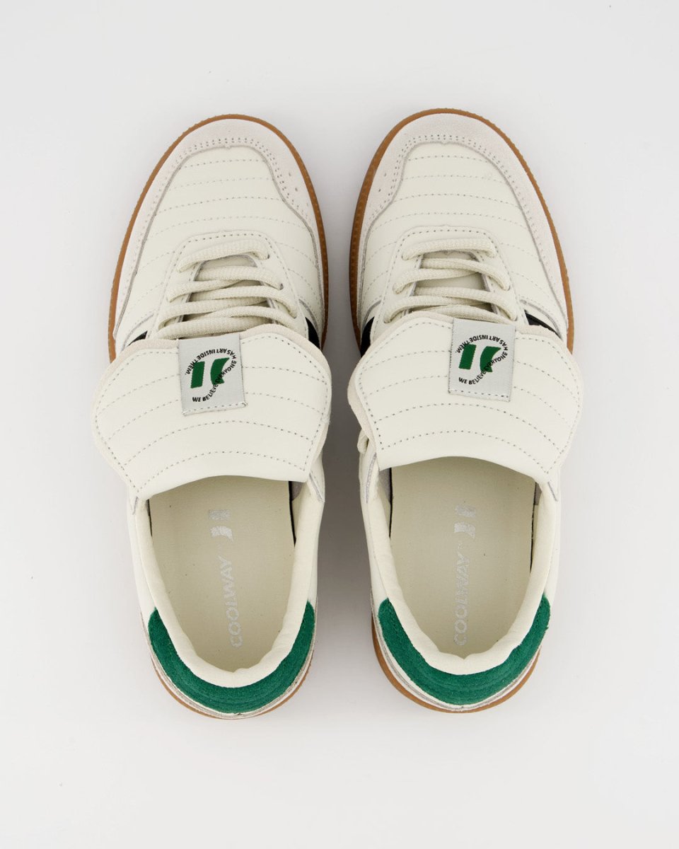 Zapatillas deportivas bajas de inspiración indoor soccer. Corte de piel pulida combinada con serraje al tono. Como peculiaridad tiene una lengüeta vuelta y pespunteada. Cierre con cordonera y talón ligeramente acolchado, con múltiples pespuntes hecho de piel serraje contrastada. Suela fina de goma y gel. El gel es visible en la planta ya que este se encuentra de manera interna en la parte del talón para mejorar la amortiguación.