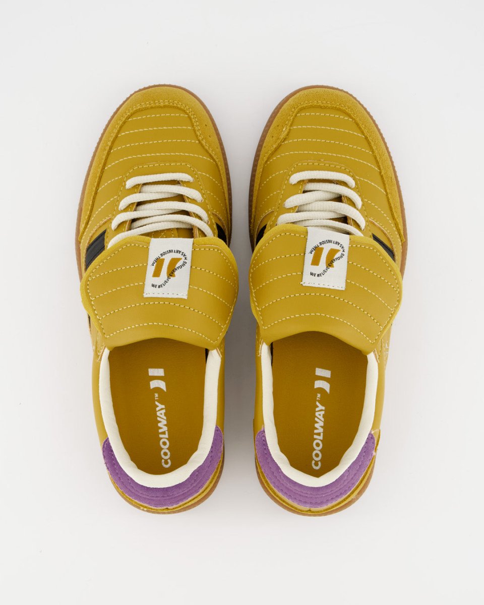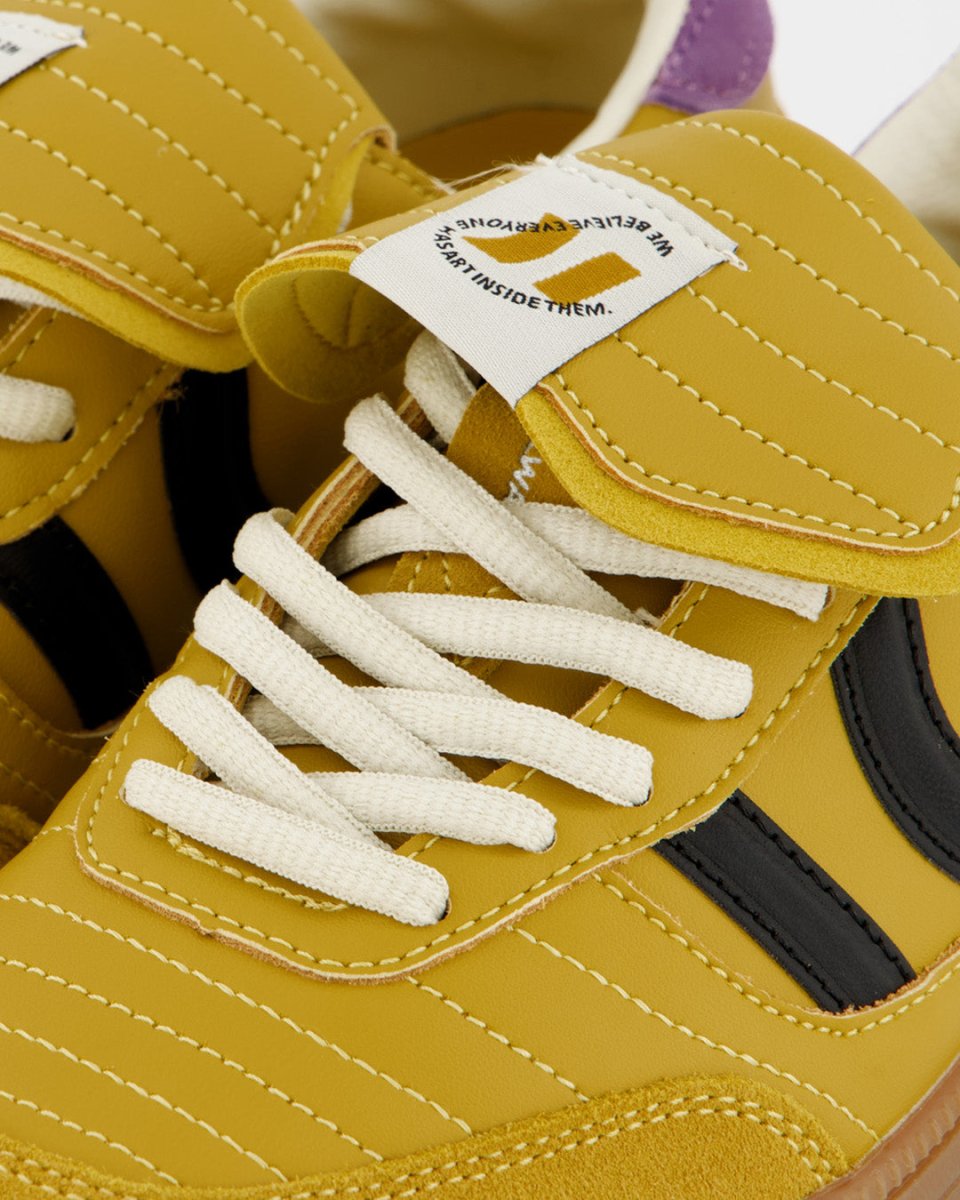 Zapatillas deportivas bajas de inspiración indoor soccer. Corte de piel pulida combinada con serraje al tono. Como peculiaridad tiene una lengüeta vuelta y pespunteada. Cierre con cordonera y talón ligeramente acolchado, con múltiples pespuntes hecho de piel serraje contrastada. Suela fina de goma y gel. El gel es visible en la planta ya que este se encuentra de manera interna en la parte del talón para mejorar la amortiguación.