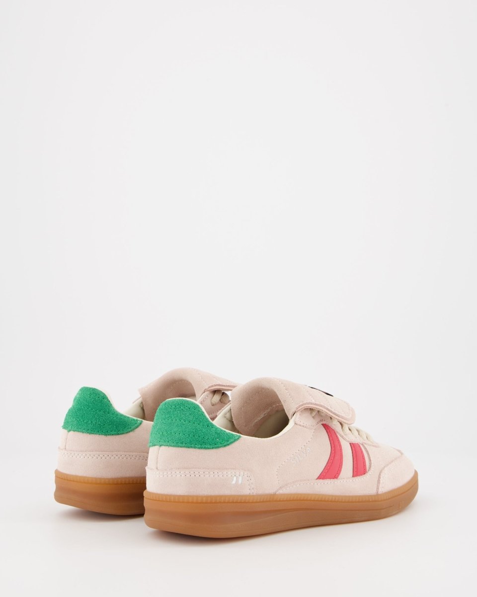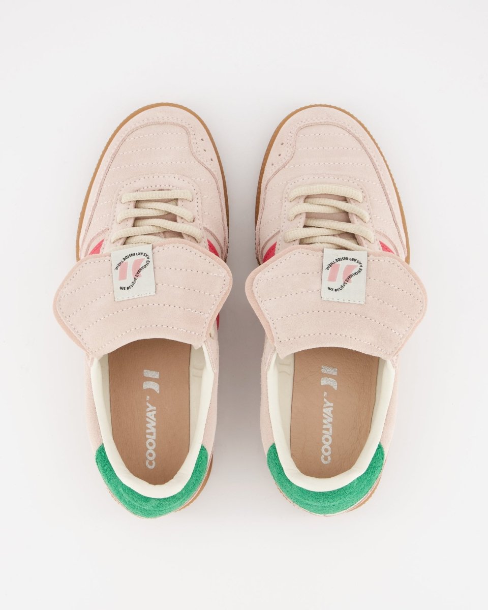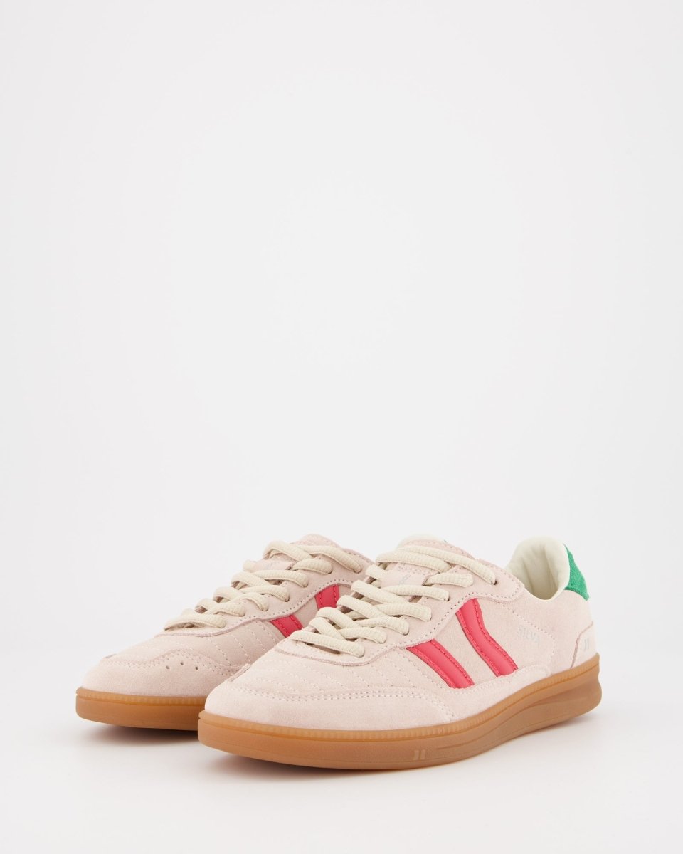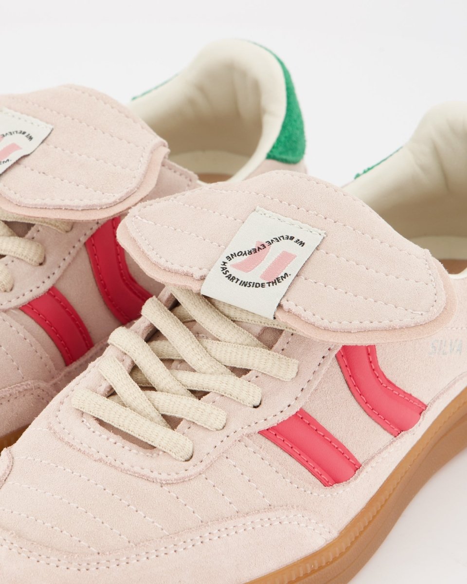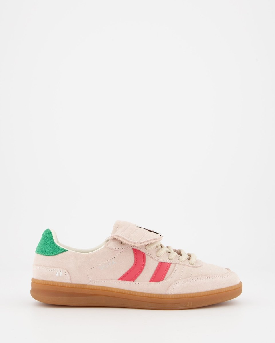 Zapatillas deportivas bajas de inspiración indoor soccer. Corte de piel pulida combinada con serraje al tono. Como peculiaridad tiene una lengüeta vuelta y pespunteada. Cierre con cordonera y talón ligeramente acolchado, con múltiples pespuntes hecho de piel serraje contrastada. Suela fina de goma y gel. El gel es visible en la planta ya que este se encuentra de manera interna en la parte del talón para mejorar la amortiguación.