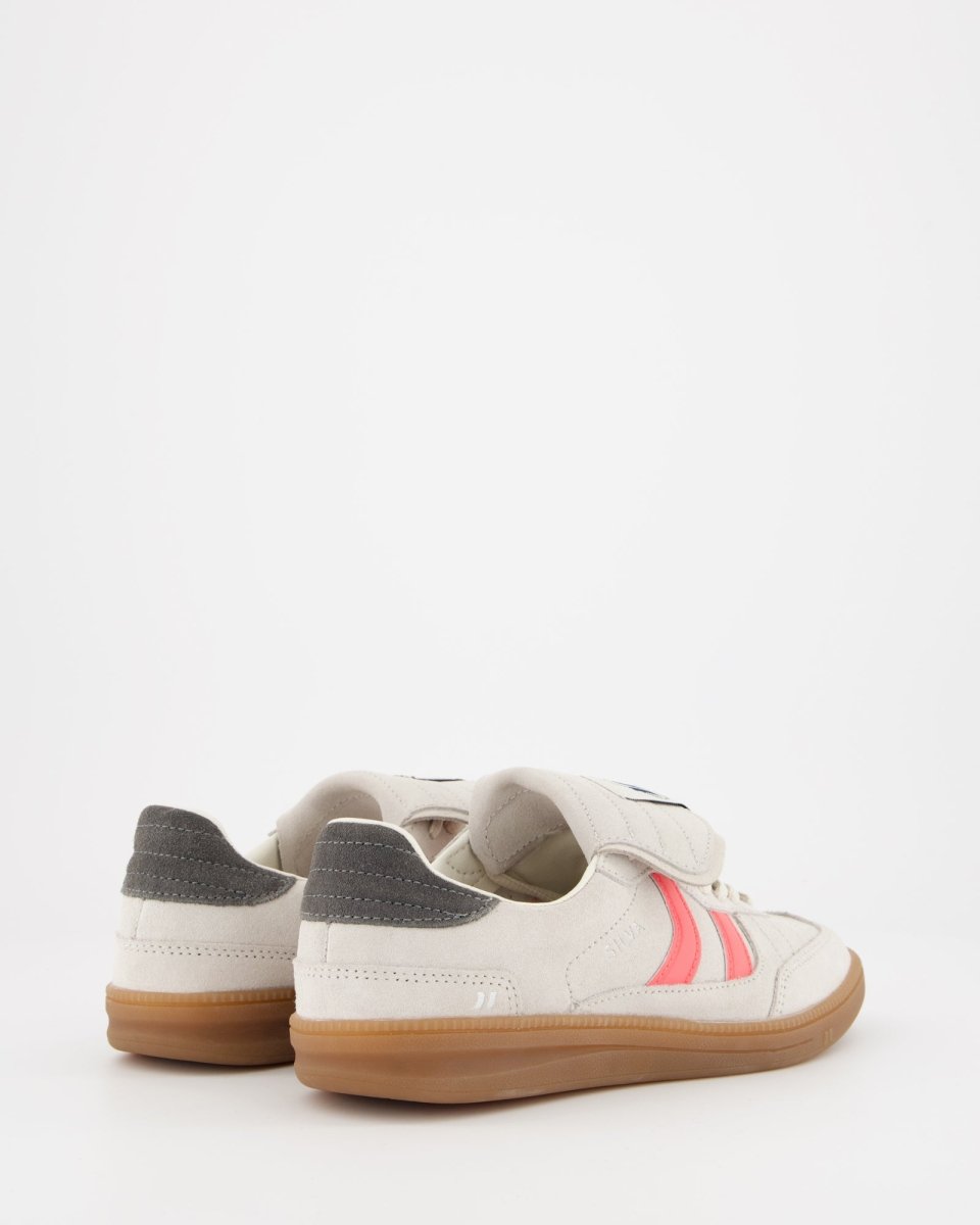 Zapatillas deportivas bajas de inspiración indoor soccer. Corte de piel pulida combinada con serraje al tono. Como peculiaridad tiene una lengüeta vuelta y pespunteada. Cierre con cordonera y talón ligeramente acolchado, con múltiples pespuntes hecho de piel serraje contrastada. Suela fina de goma y gel. El gel es visible en la planta ya que este se encuentra de manera interna en la parte del talón para mejorar la amortiguación.